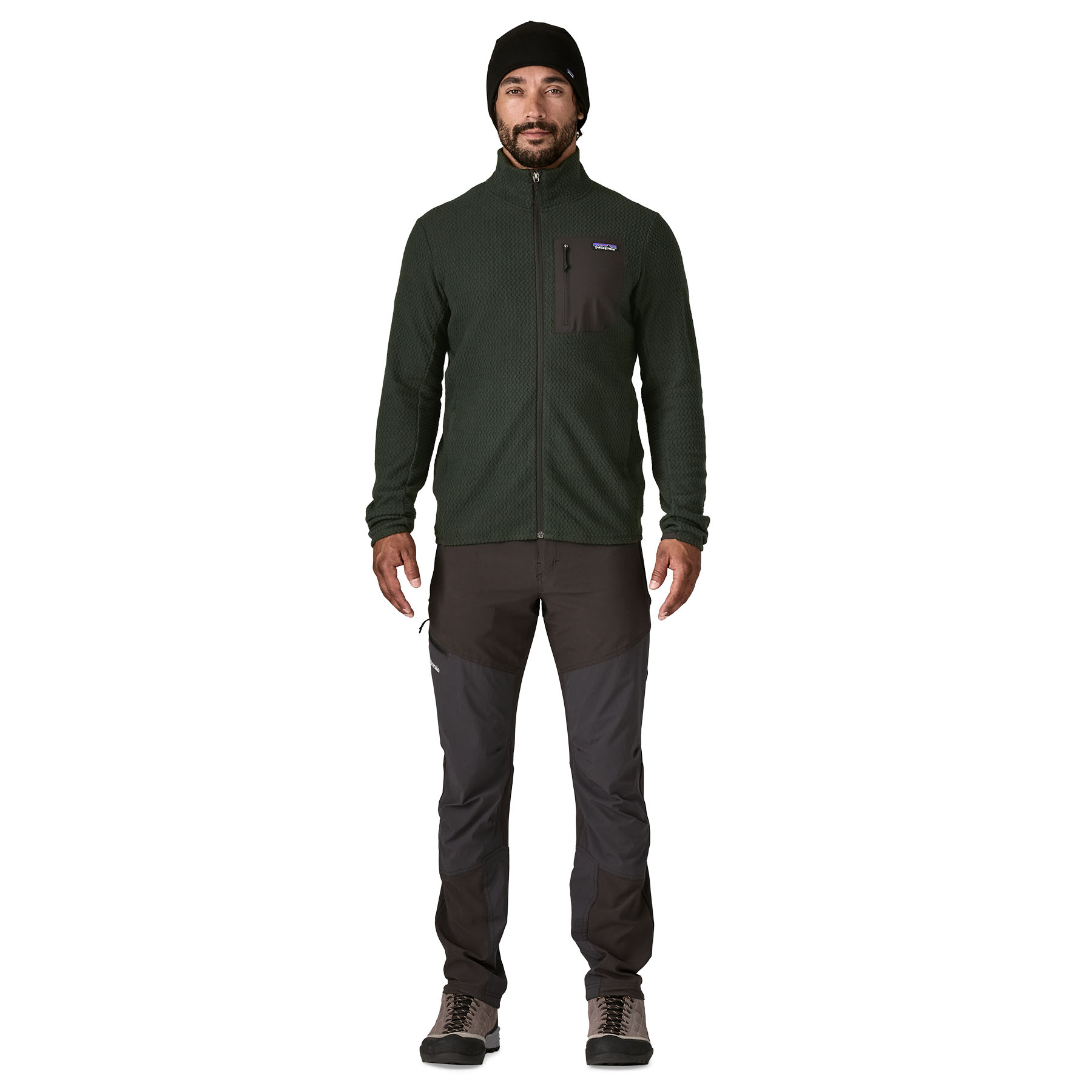 The airy, warm, and breathable fabric is made from 100% recycled polyester jacquard fleece with hollow-core yarns that wick moisture, dry quickly, and provide excellent breathability for cool-weather activities.